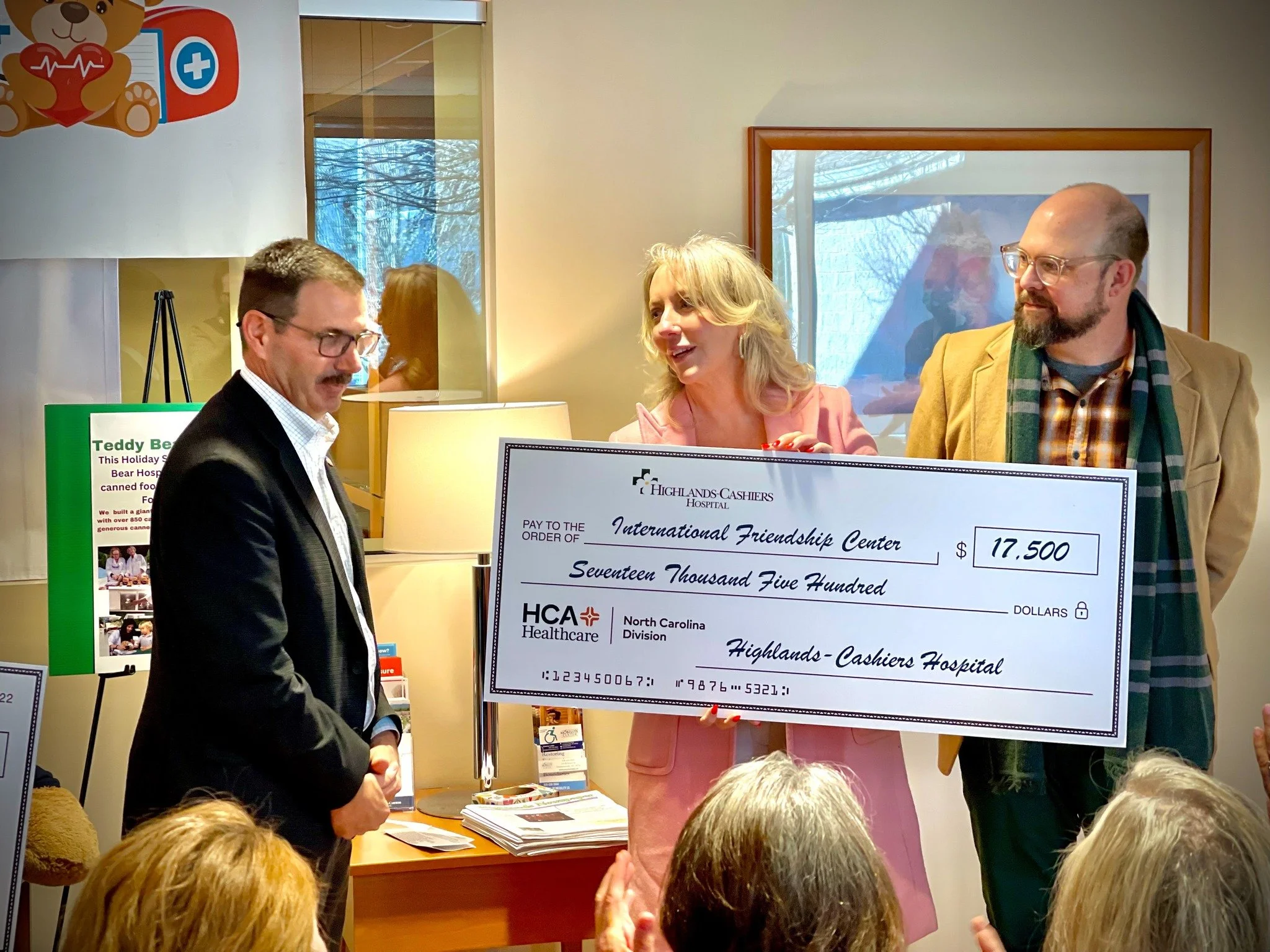 Food Pantry Director, Bonnie Dayton (center), and Executive Director, T. J. Smith (right), accept a check from the Highlands Cashiers Hospital CEO Tom Neal (left).